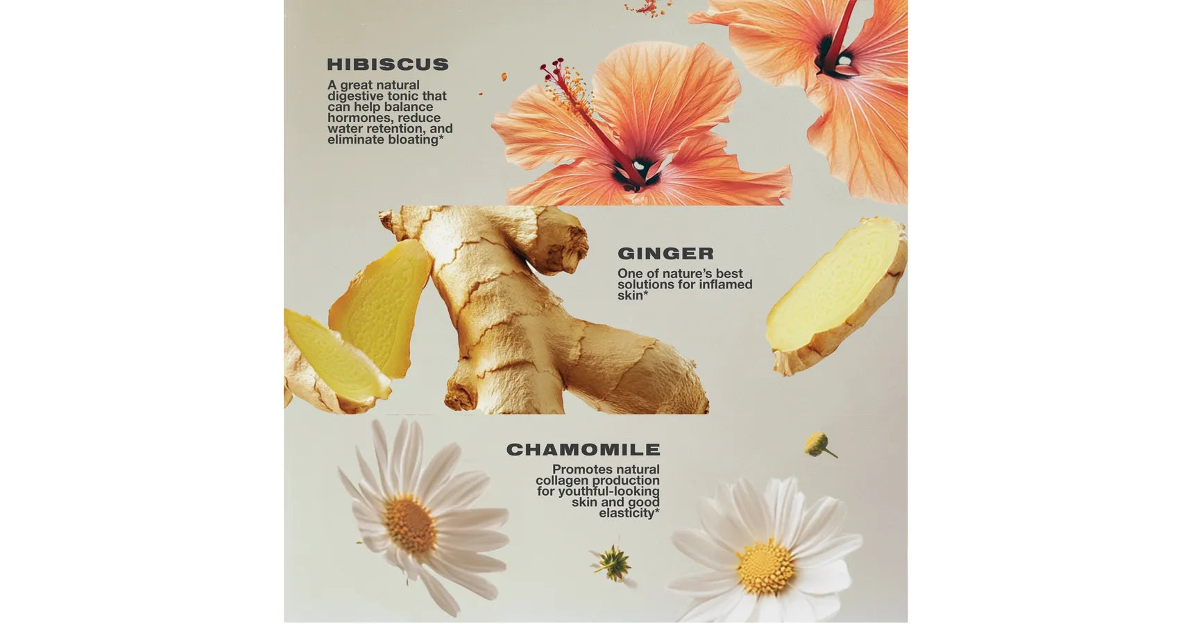 Soothe puffy face + body skin with natural ingredients targeted to calm sensitive tissues. De-puff with the antiswelling properties of ginger and hibiscus, and target irritation, and even dark circles, with antioxidants found in Chamomile.